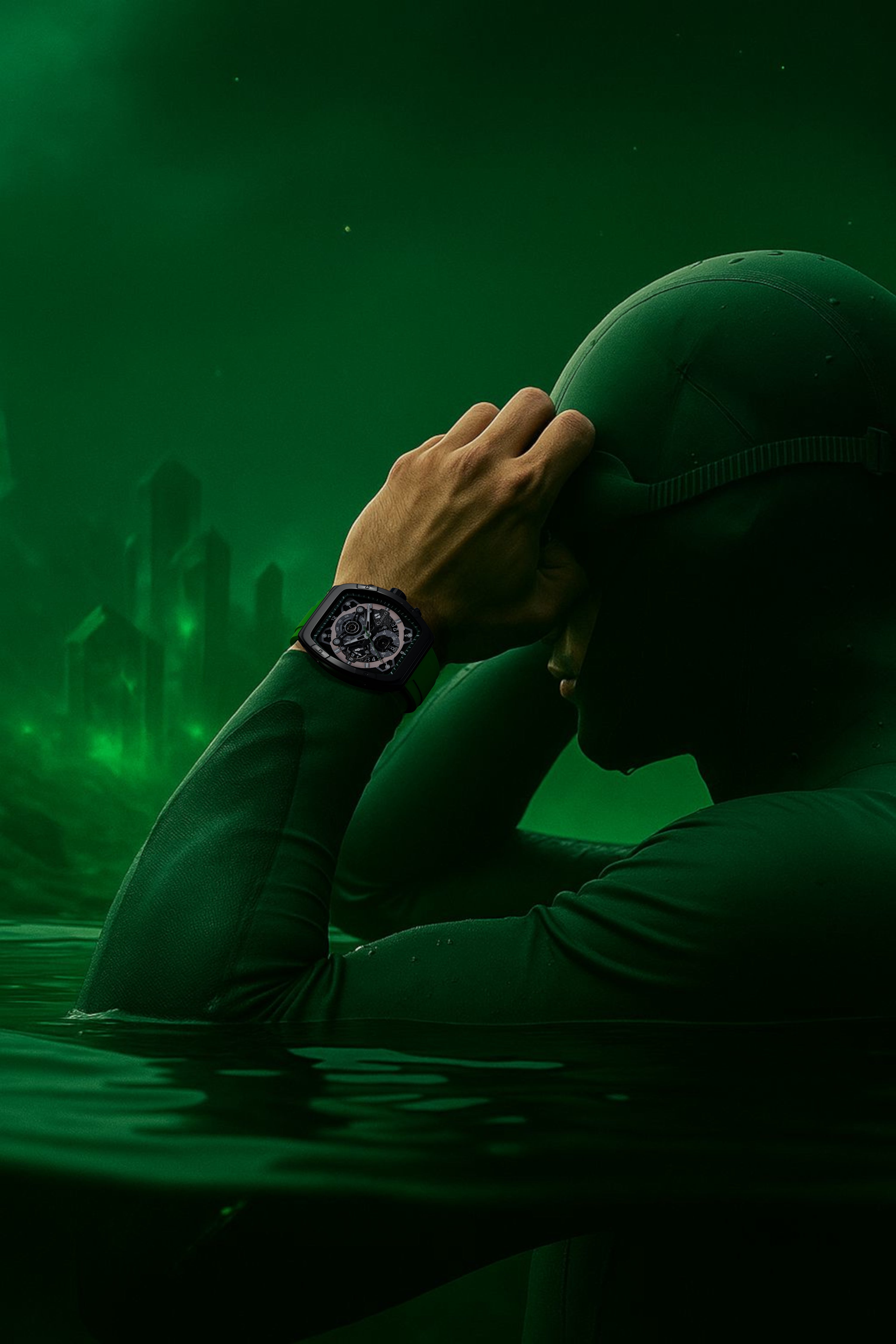 كل حركة من حركات يديها تعكس إيقاع الصبر والقوة، فن معرفة متى تنقض ومتى تهدأ. ينساب السوار الأخضر حول المعصم كهمسة تجدد، مانحاً مرتديه ثباتاً وحضوراً.